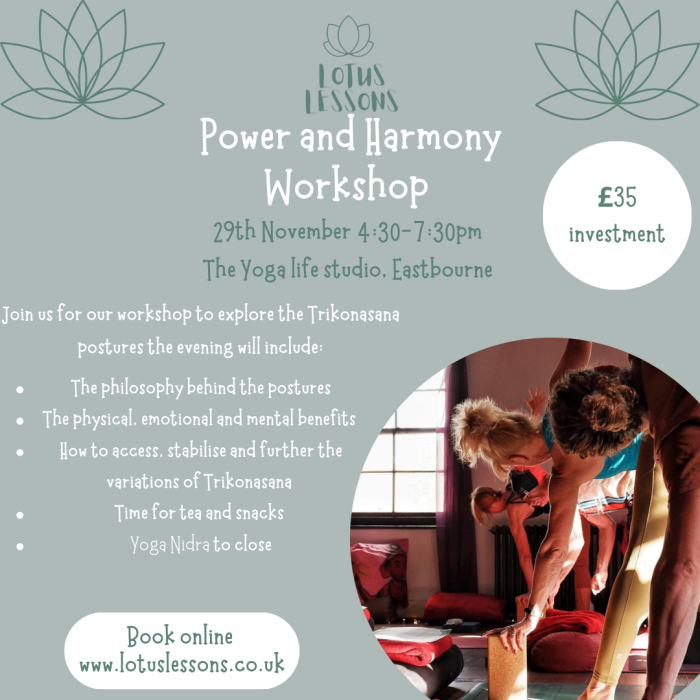 Afterwards, we will put our knowledge to our practice and use the last hour to move through the postures in a sequence I have created to incorporate all we have explored followed by some meditation and breath-work to find further stability and harmony in mind, body and being.